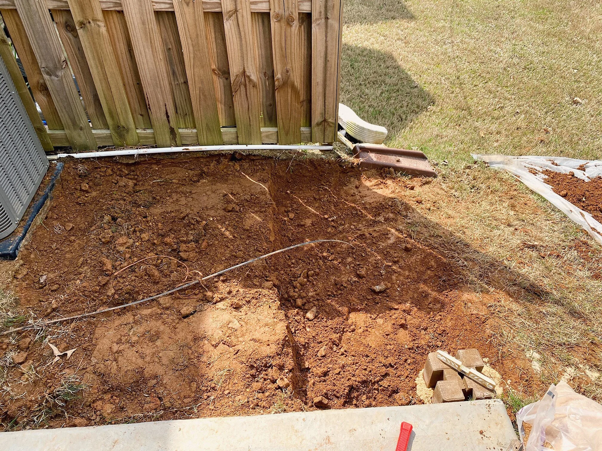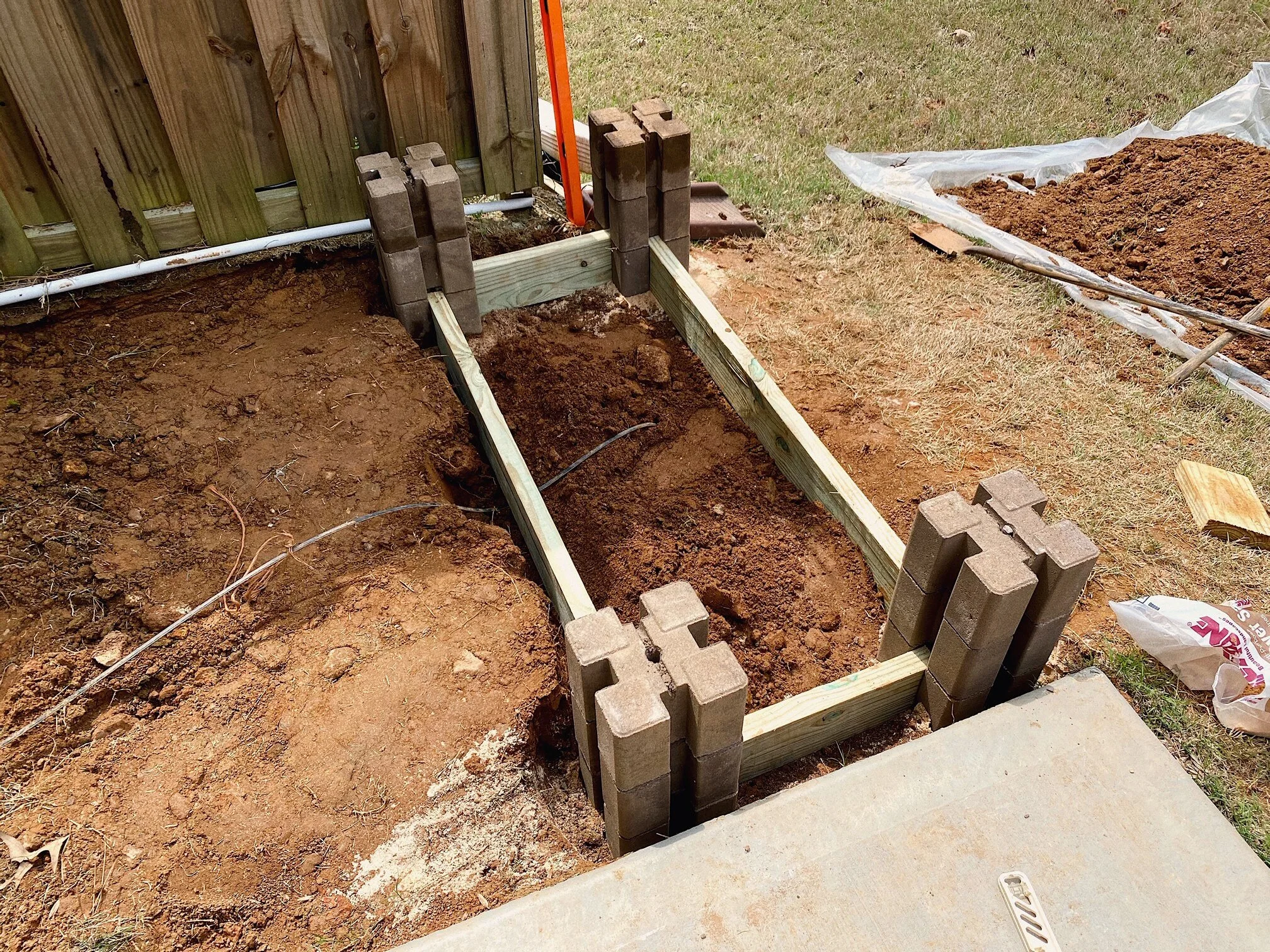 3. Once it’s dug, start with a planter wall block. Use a hard flat object (such as a piece of scrap wood) and the drilling hammer to compact and level out the spot where the block will go. Use the sand to make sure it’s perfectly level. Once the wall block is level and in place, move on to the next block and repeat.